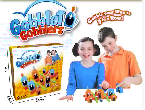 A rajzfilmfigurák izgalmassá teszik ezt a tic-tac-toe stílusú játékot. Egyszerűen sorakoztasd fel három Gobblers figurádat egymás mellé, és nyertél. De vigyázz! Ezek a Gobblers figurák éhesek a szórakozásra... és más Gobblers figurákra.