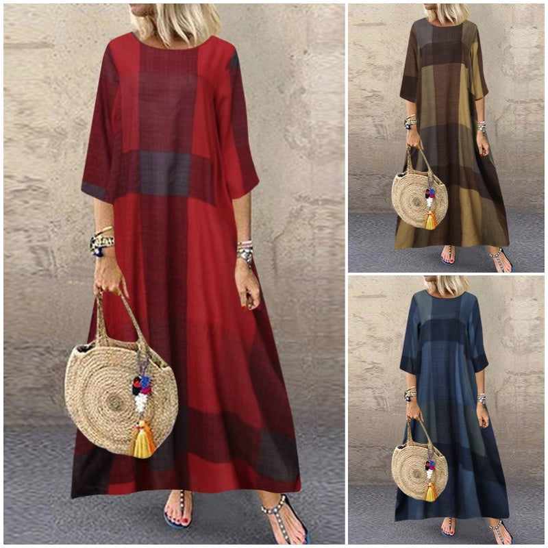 A csomag tartalmazza: A csomagban található a következő termékek: 1 * Női alkalmi kockás nyomtatás kerek nyakú Maxi ruhák