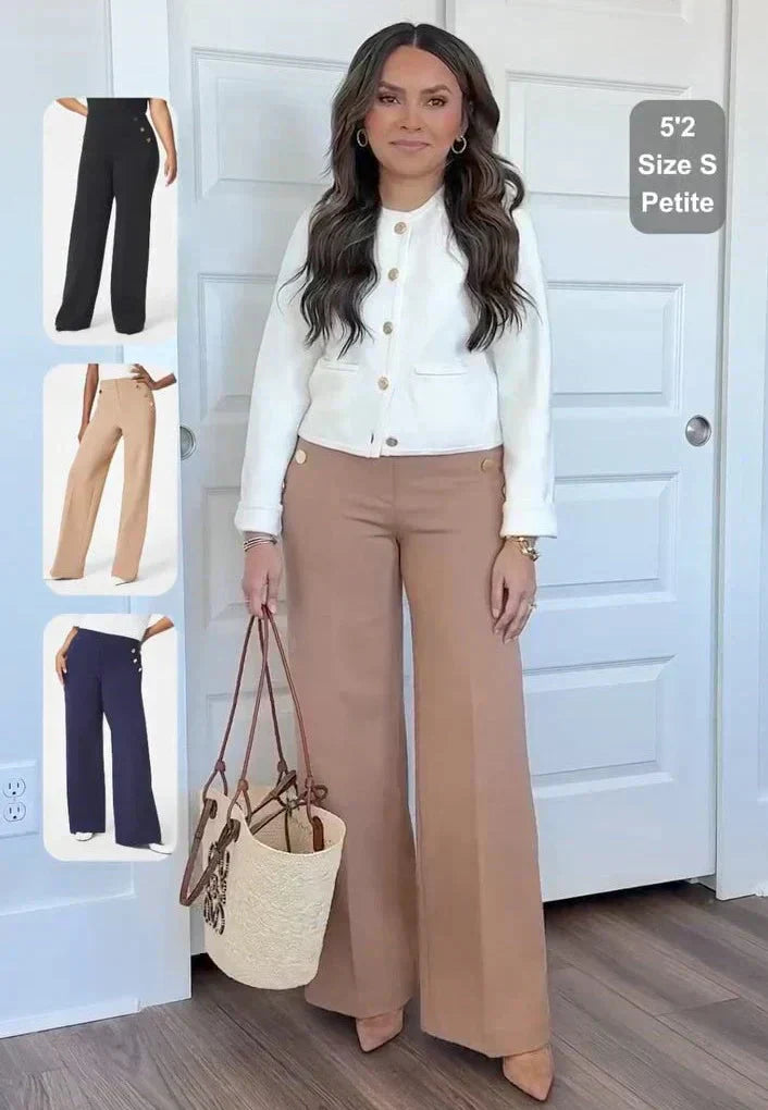 Ez a gĂ©pben moshatĂł, szĂ©les szĂĄrĂș nadrĂĄg simĂtĂł prĂ©mium ponte anyagbĂłl kĂ©szĂŒlt, kĂ©nyelmes, hĂșzĂłzsinĂłros szabĂĄssal Ă©s arany dĂszgombokkal.