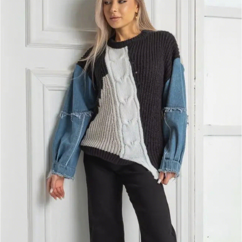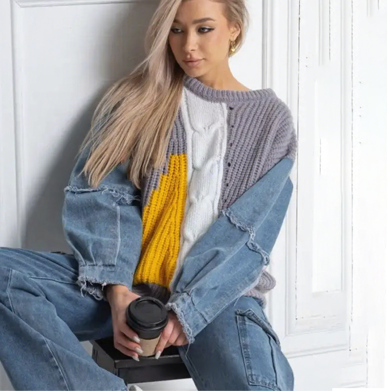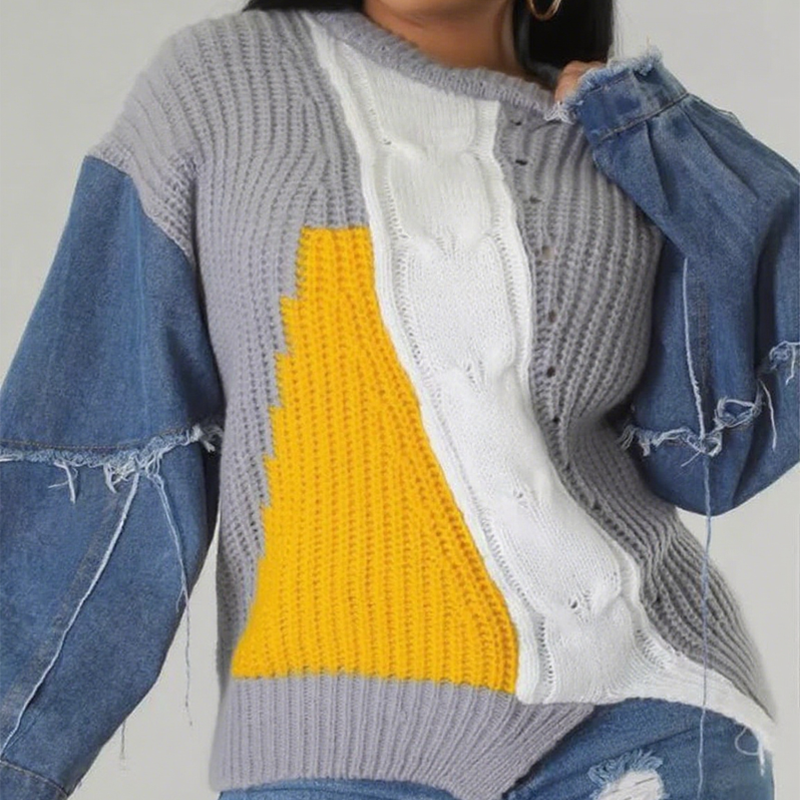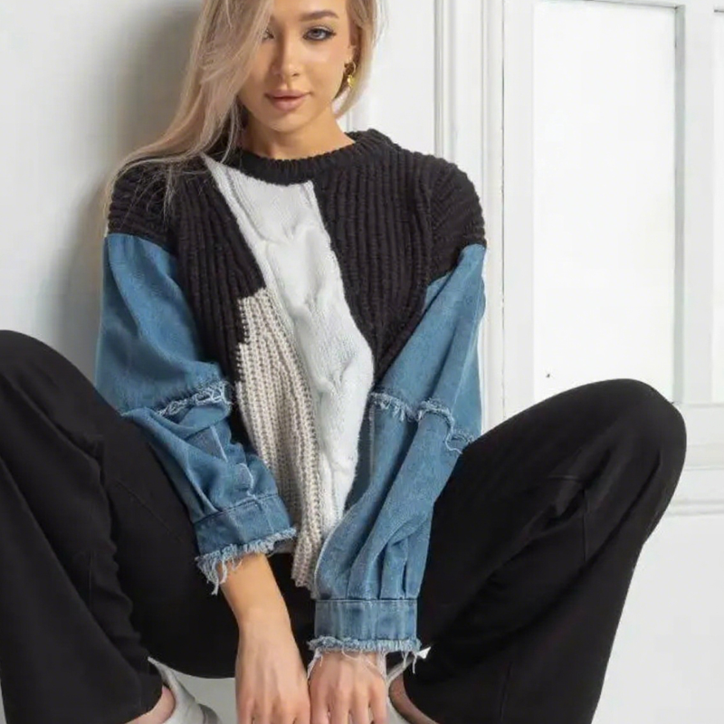 EGYEDI PATCHWORK STÍLUS: Ez a női pulóver kreatív farmer és kötött patchwork dizájnnal rendelkezik, amely ötvözi az alkalmi bájt a modern divattal. A kontrasztos textúrák vizuális érdeklődést keltenek, így ez egy olyan statement darab, amely könnyedén feldobja a hétköznapi öltözékeket.