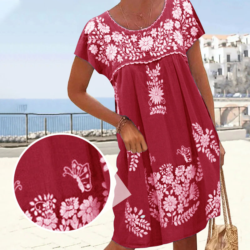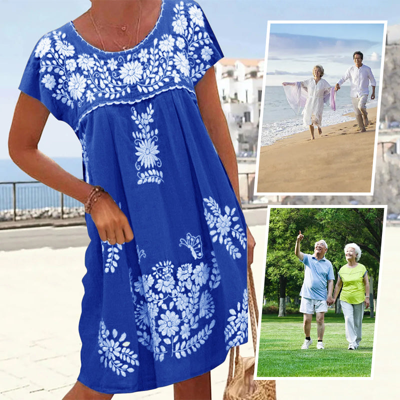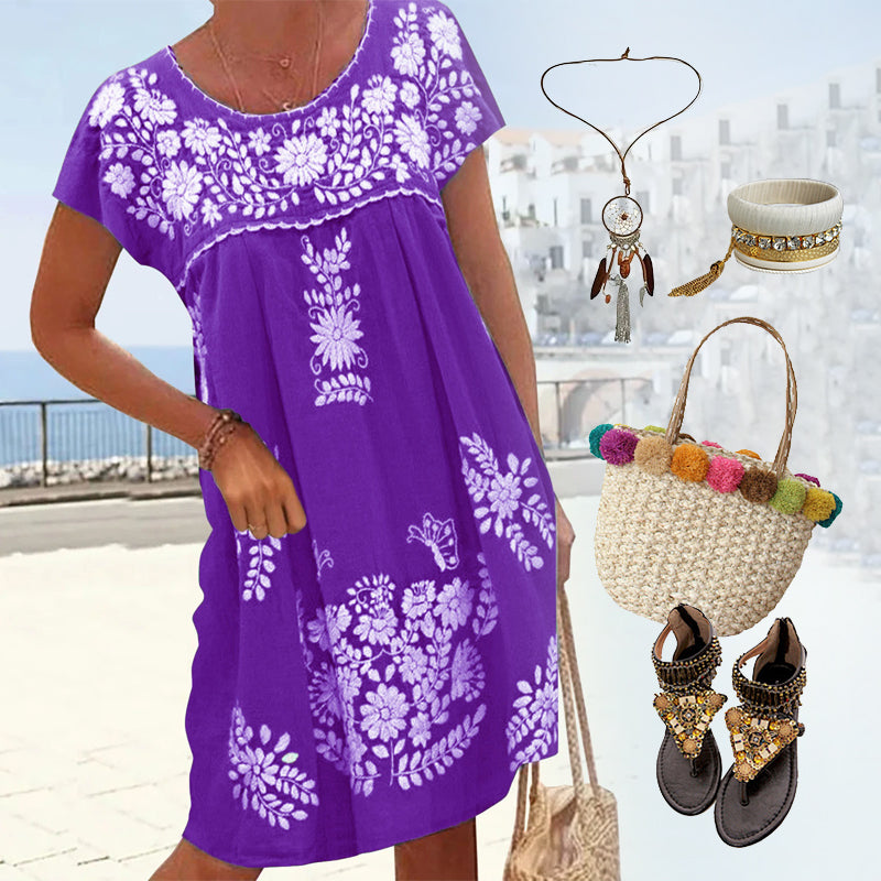 ETNIKAI IHLETÉSŰ DÍSZÍTÉS: Ünnepelje az egyéniséget ezzel a szemet gyönyörködtető virágmintás ruhával, amelyet a hagyományos kézművesség ihletett. Az élénk minták és a gazdag színek (zöld, lila, szürke, kék, piros) kiemelkedő darabot alkotnak azok számára, akik szeretik az egyedi, kulturálisan áthatott divatot.