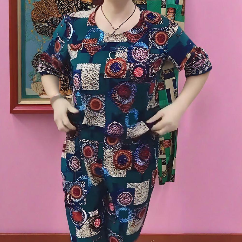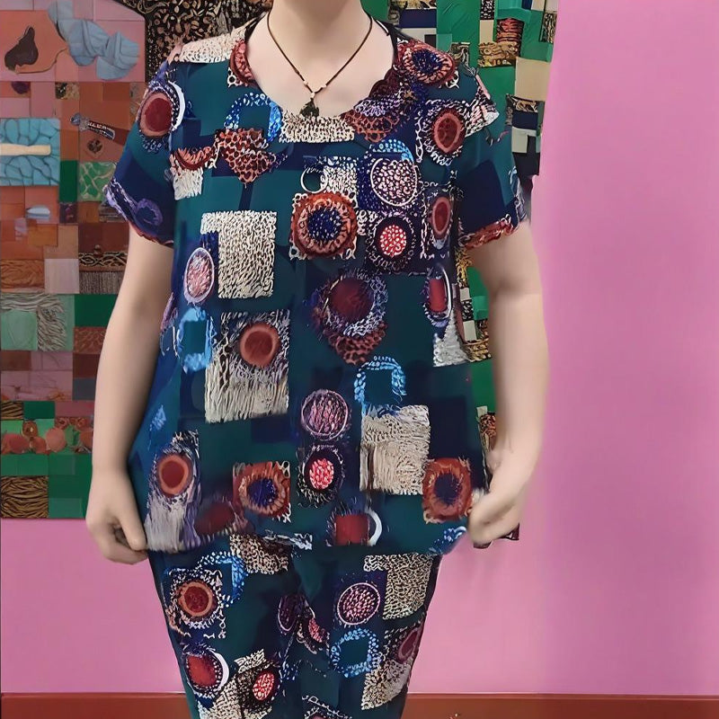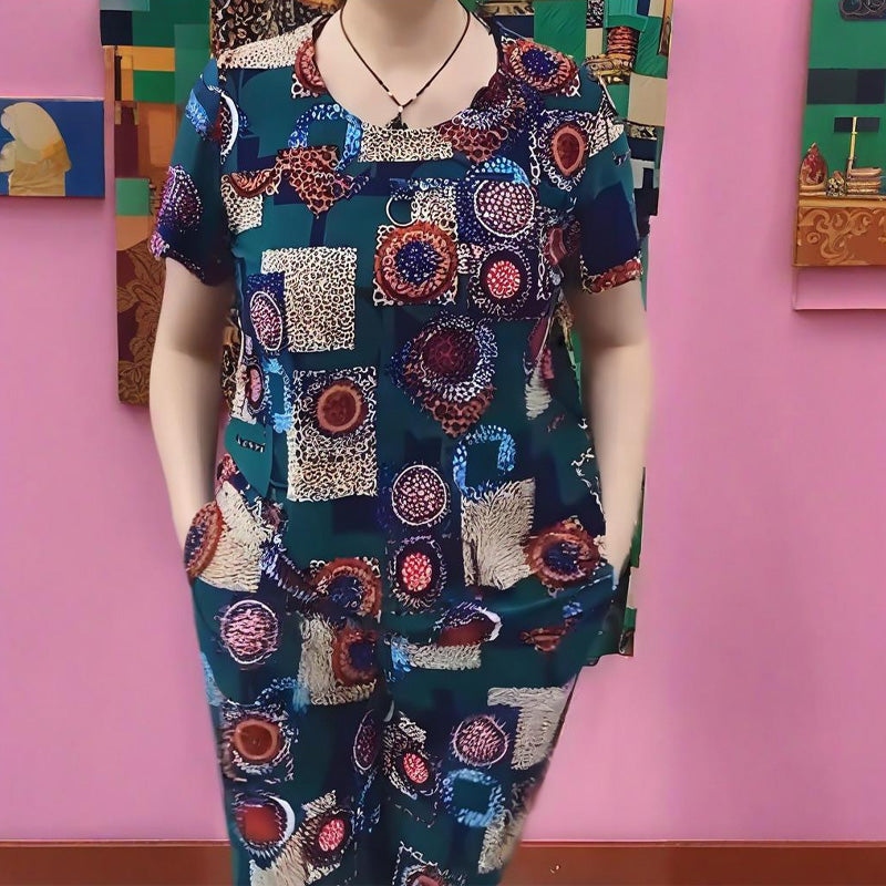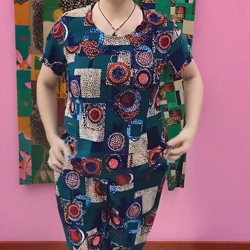 Съдържание на опаковката: 1 брой дамски комплект с къса ръкава и панталони с принт