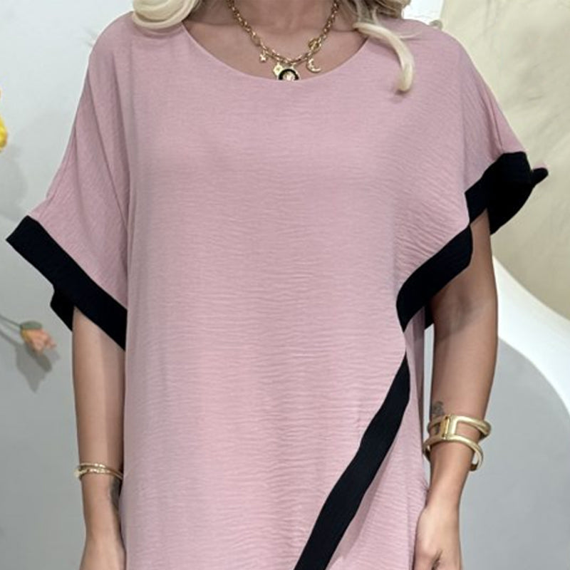 ELEGANT DESIGN: The set features a unique top with an asymmetrical hemline and wide-leg pants, both in a soft pink color with sleek black trim. The contrasting edges add a bold, stylish touch, making it perfect for those who want to stand out.